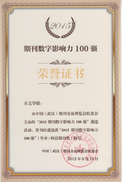 在中国(武汉)期刊交易博览会组委会主办的“2015期刊数字影响力100强”遴选活动中,《天文学报》获“2015期刊数字影响力100强”(学术/科技期刊类)称号。