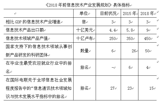 俄罗斯总理梅德韦杰夫在部长办公会议上指出,俄罗斯IT产业需要突破式发展。通过《2018年前信息技术产业发展规划》的实施,力争使俄罗斯IT产业服务出口额提高两倍。