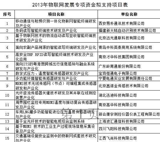 近日,工业和信息化部、财政部对2013年物联网发展专项资金拟支持项目予以公示,具体内容如下: